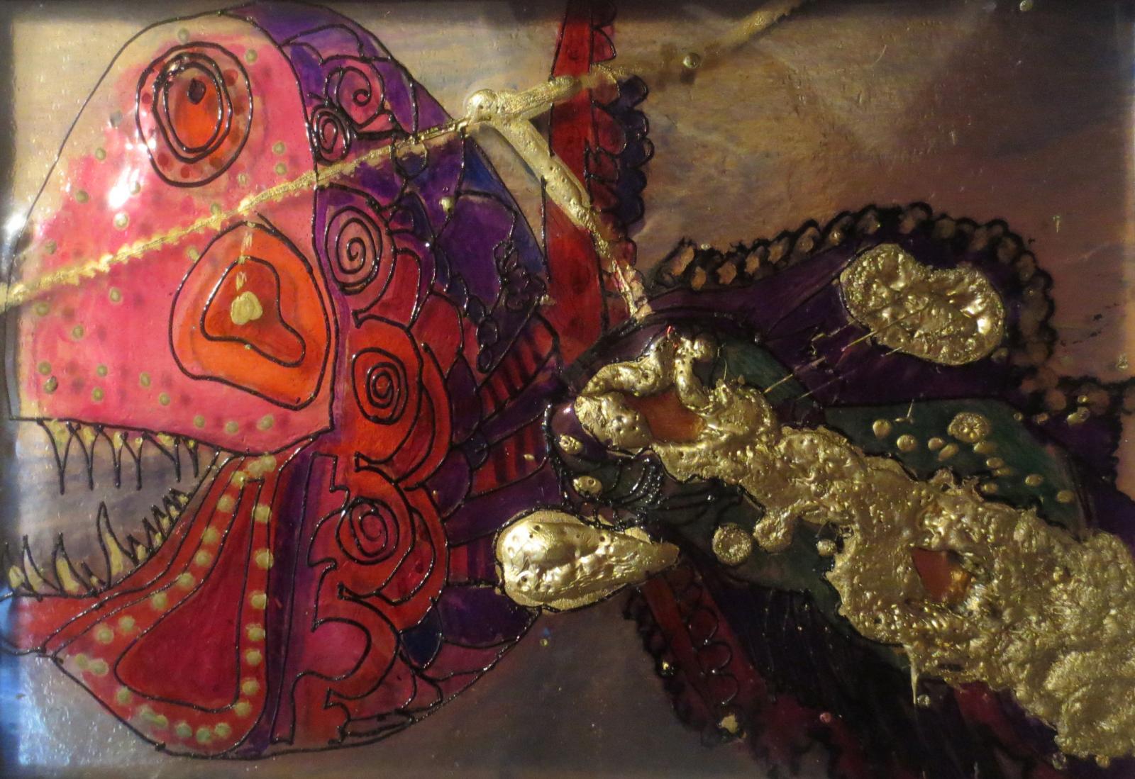 Miniature (approx. 3,75 (w) by 3.27 (l). Oil based inks and gold paint on graphix.
