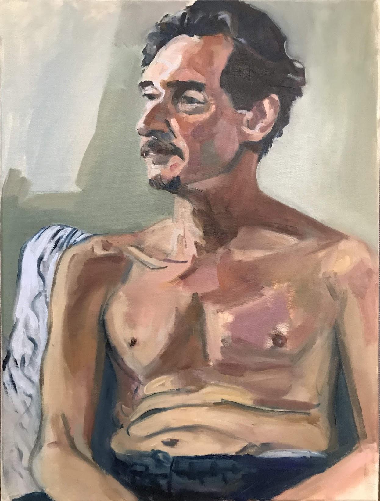 Oil portrait of seated model, semi clothed, in natural lighting