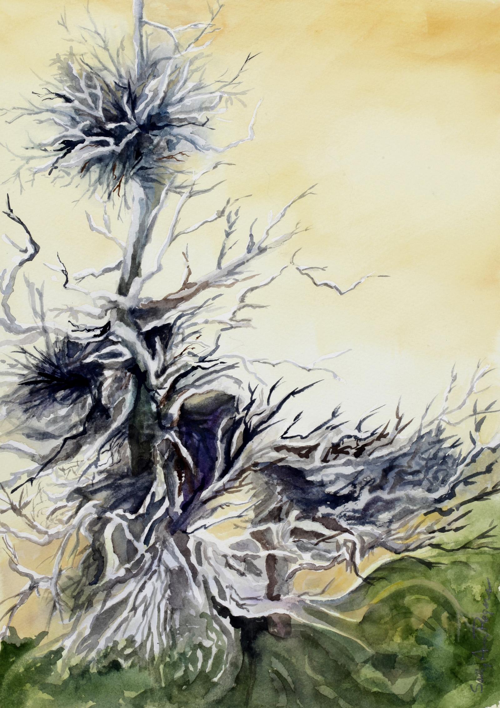 Watercolor of an a disease infestation on an evergreen that is referred to as witch's broom.
