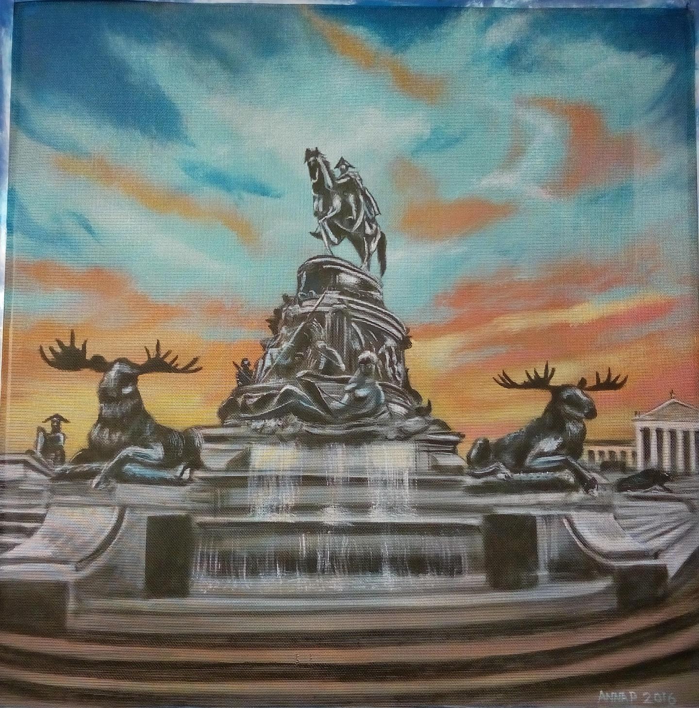 Painted window screen of the George Washington Monument Fountain at Philadelphia Museum of Art