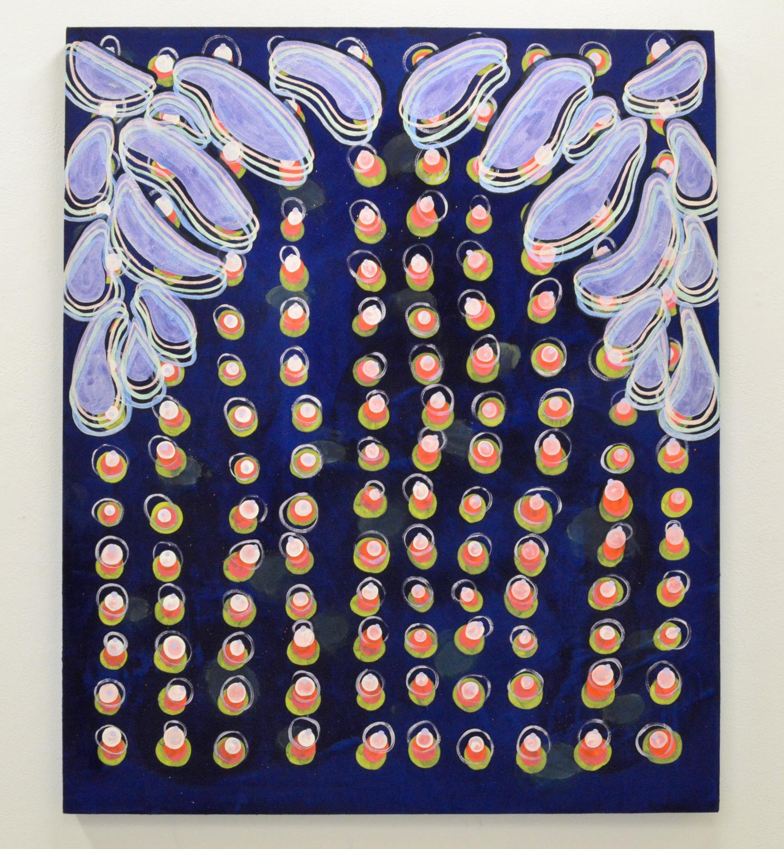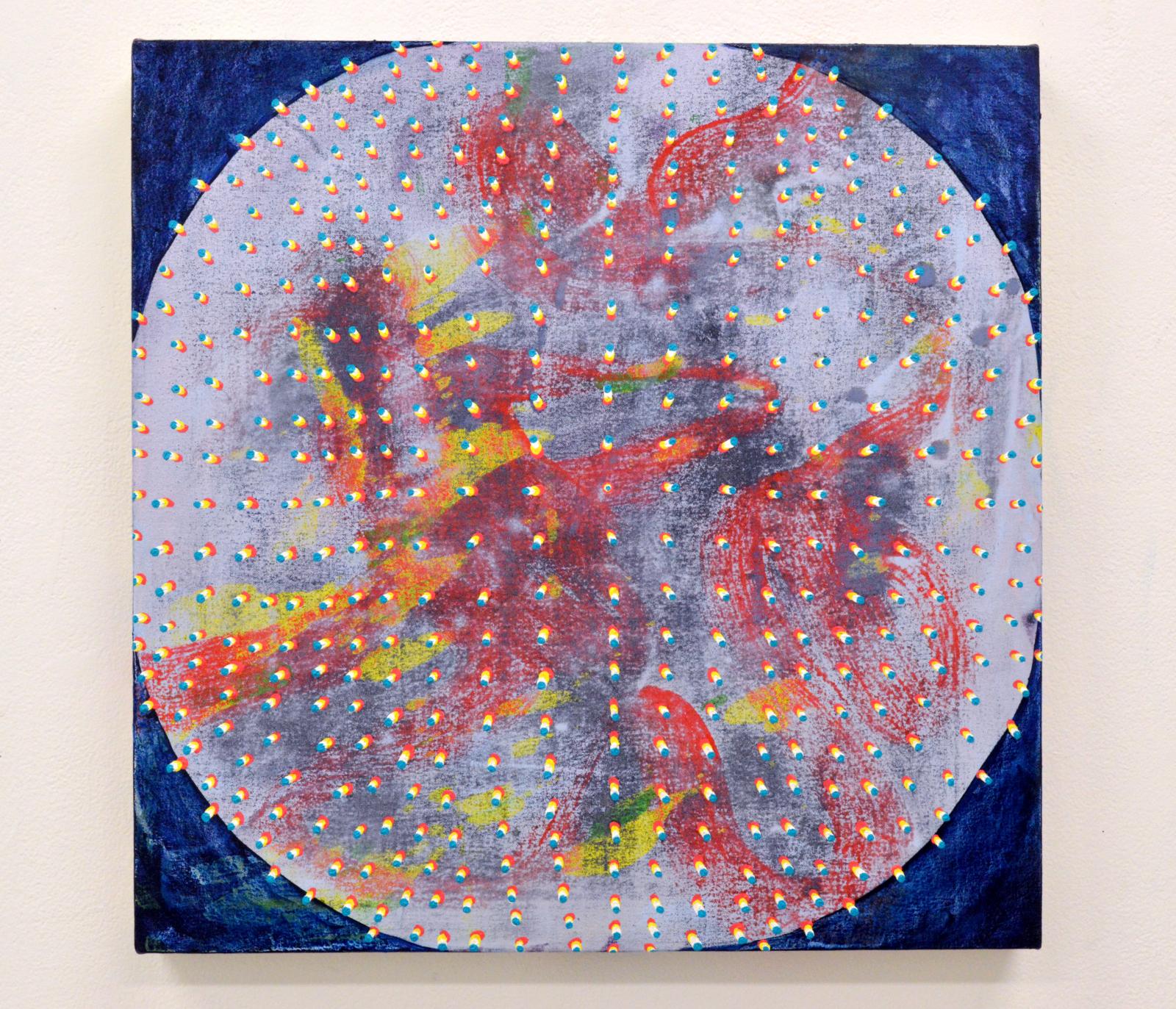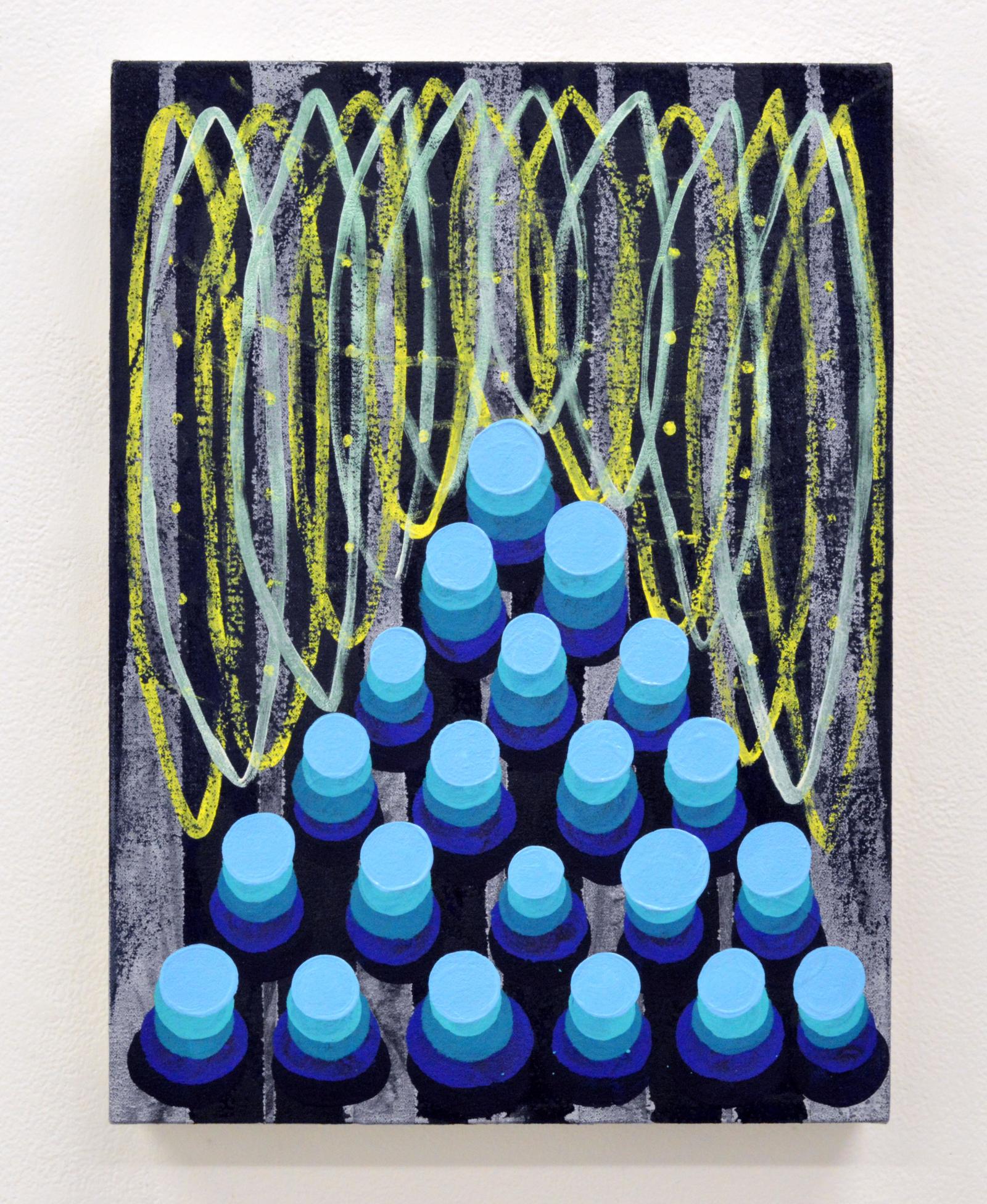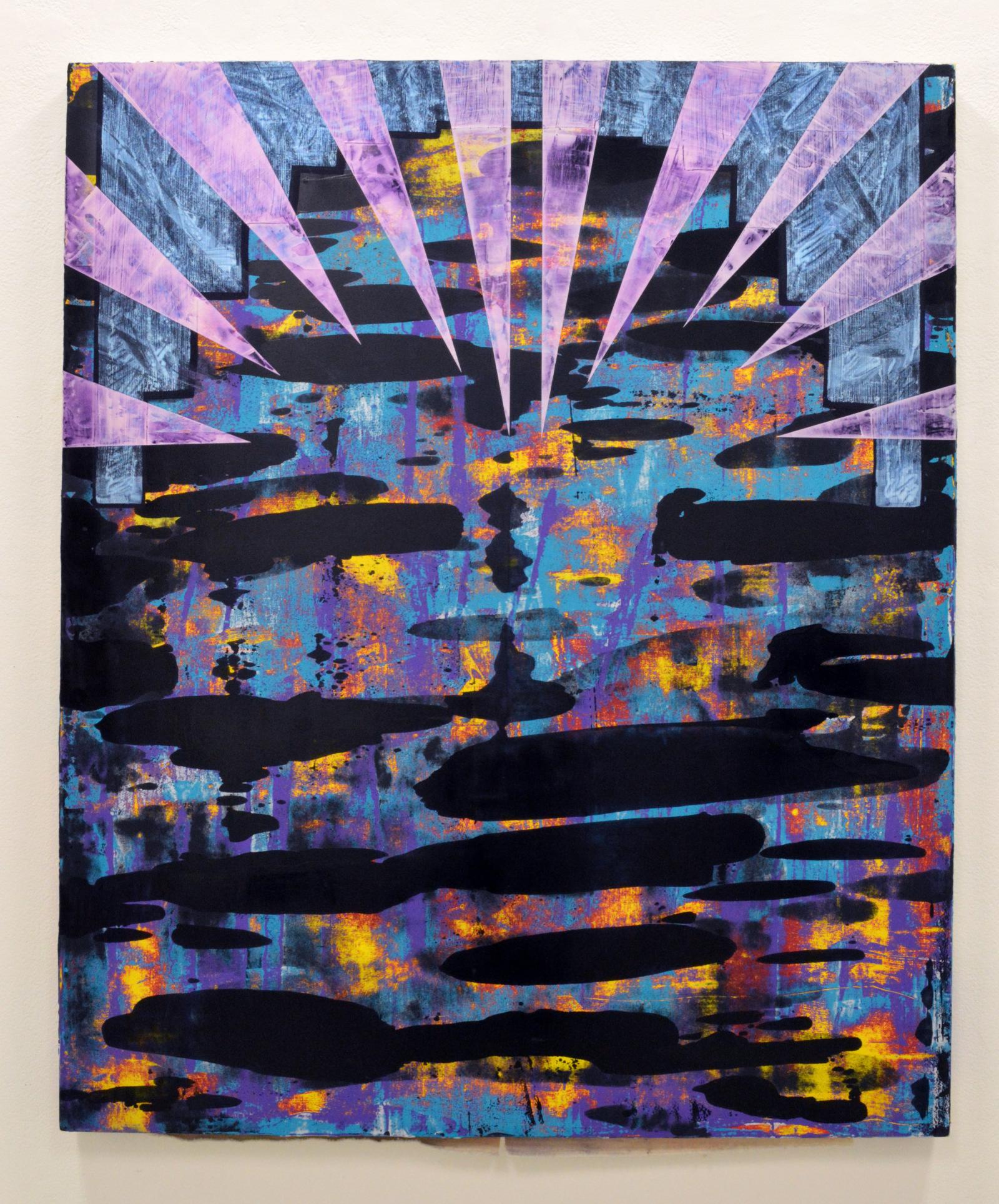 My work pushes notions of androgyny and queer, combining both masculine and feminine qualities to establish something that is gender-neutral, gender fluid, transgender, or genderqueer. My practice serves as rigorous experimentation that employs a scientific approach; I often juggle multiple paintings and add layers simultaneously to each current work, marginally altering a property to study the outcome. I also employ craft materials, primarily glitter, in order to recall femme, makeup, club, or drag cultures. Assorted recipes bring about diverse results, allowing my work to be a survey of potentially queer objects. Being a painter who is strongly concerned with materiality, I allow the physicality of my work to arise from the alchemy of the paint. I often use various mediums and processes to create paint from scratch, break it down, change opacity and viscosity, adjust chromatic properties, or alter surface qualities as I feel needed. Various types of paint mixtures are layered over time, only to be smeared, scraped, and sanded, charging the work with a visceral energy that refers back to the physicality of process and the body. The process of covering and erasing these layers I have built up creates a back-and-forth of additive and subtractive, an accumulation and a diminishing. My current paintings revolve around the notion of creating space, particularly through abstraction from a queer perspective with a playful awkwardness. These self-contained worlds are made up of repeating stripes, gradated forms, twisted squiggles, and organic shapes. Skewed geometry with hard edges flirt with expressive grounds and fields of color, creating an ambiguous space that is dizzying, strange, and dynamic. The quirky geometry and irregularity of patterns allow for vulnerable and imperfect moments, and are equally about sameness as they are about difference. The work, both as physical objects and as windows into an illusionistic world, suggests a transfer between states— erratic and ever-evolving.Featured Work