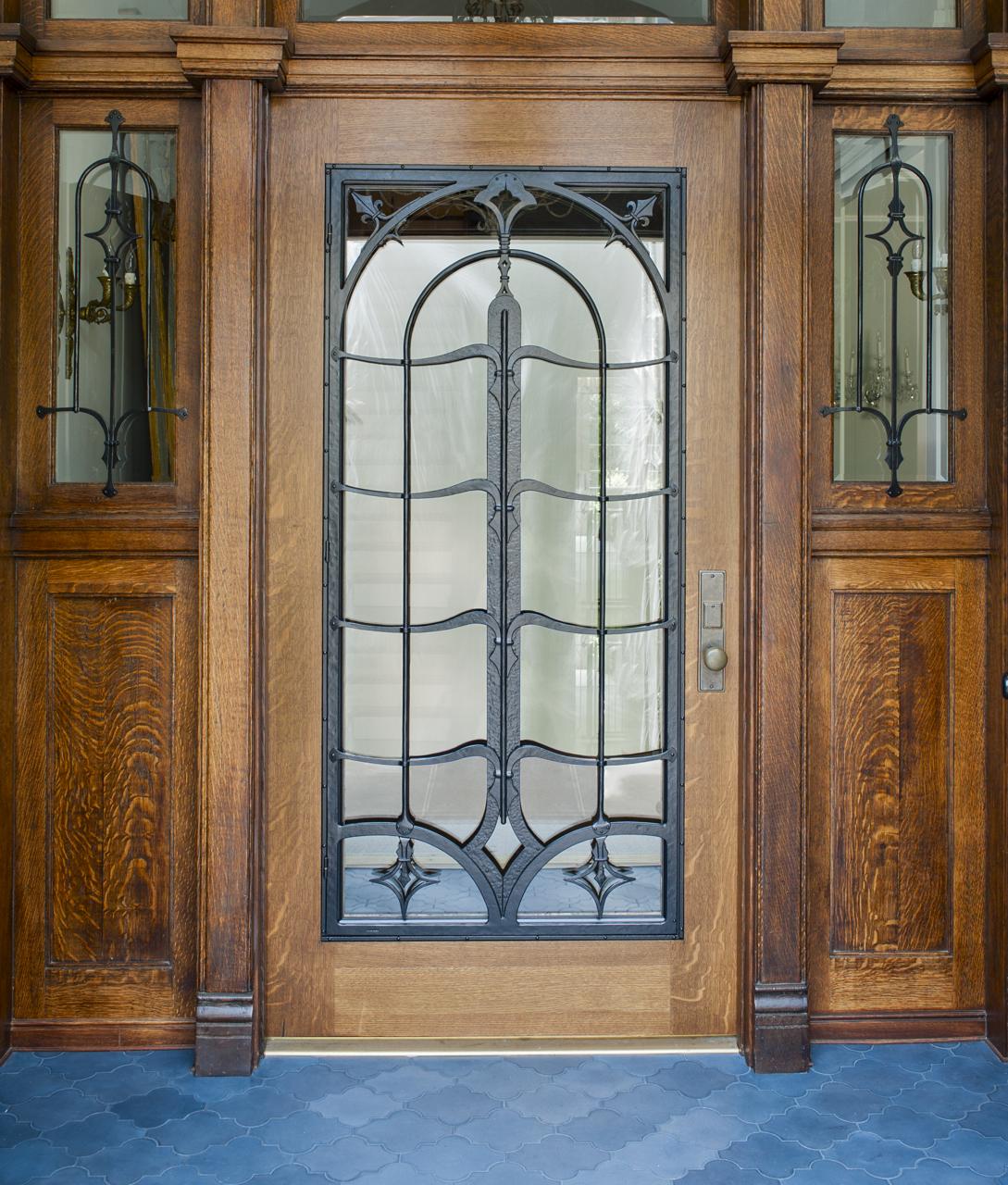 Iron grille and sidelights created for former embassy turned private residence in Washington, DC. Inquiries are welcome about new architectural commissions.