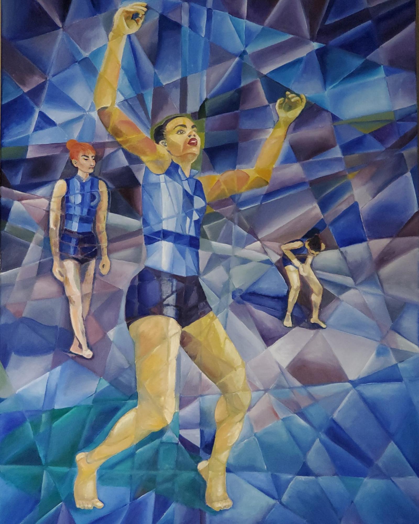 I use oil paint and brushes on gallery wrapped canvas to layer colors and textures. My style is close to abstract cubism, but with a mix of realism. I create portraits of dancers and landscapes. I use jeweled toned colors that pop. The abstract background is reminiscent of unfolded creased paper. Through my work as a costume assistant and as a dancer, I am inspired by dancers’ technique and emotion. I want the viewer to see the movement in the paint and feel the emotion as if watching a dancer.