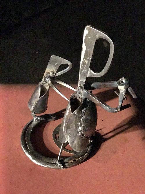 One-of-a-Kind Metal Sculpture from Found Material by Artist GJCuttler, A Man With Vision GJCuttler discovered his talent for metal sculpture shortly after turning 62. He was learning how to weld, and while practicing, created a metal man from scrap metal. He laughingly called his wife to come see his "Man with a Hole in his Head for thinking he can weld". She looked at it and said "No, that is a Man With Vision" And so started a hobby which, when someone asked him to make a piece for them, became a business. The name of the business, Another Side of Sane, is also credited to his wife, who in reply to his comment on selling his first piece of "this is insane!" said "No, it's just another side of sane." GJCuttler creates pieces that can be purchased on-line. He also accepts commission work.Artist's Statement