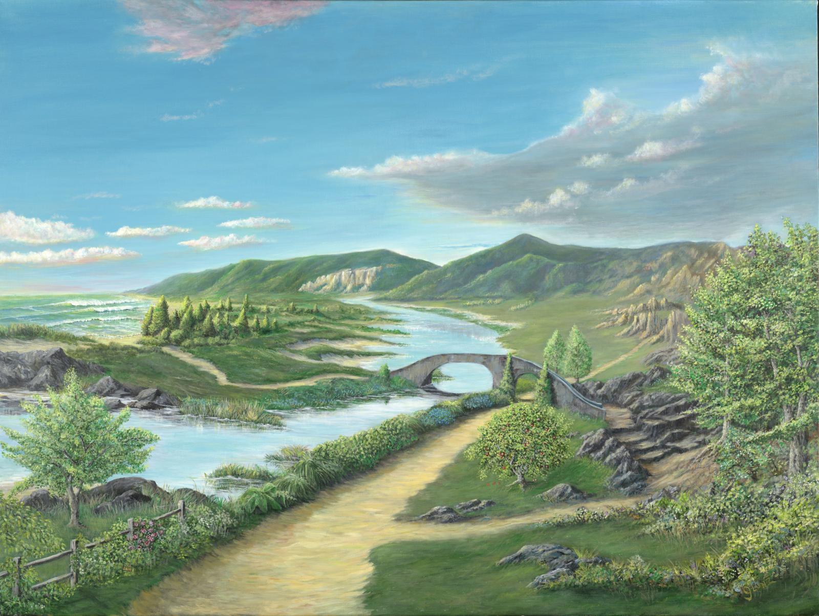 Acrylic on canvas: 36"X48" A visual art piece of the very familiar spoken work and life lessons concerning choosing your path. the painting is from a composite of many locations in Maryland. It is completed with a walking stick that sits by its side. The painting was also featured in a music video for the song "Released" by Gregson Lunz from the album of the same name. the video can be found on You tube and at www.gregsonlunz.com. the original painting has been sold but prints of many types, including; signed, limited editions.