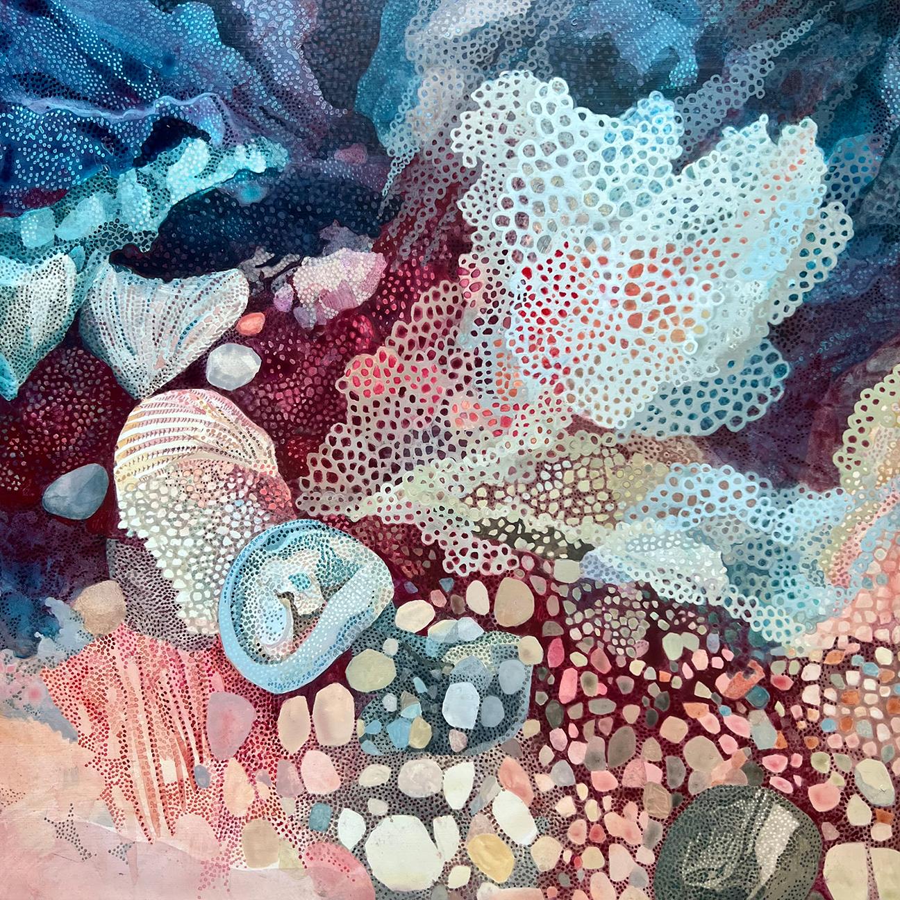 Jacqui Crocetta creates ocean-centric works in which she pays tribute to the awe and wonder she feels for nature, while responding to environmental concerns. The mindset of interconnectedness is the foundation of her work. In early 2020, after visiting a beach in Florida that was heavily polluted with plastic trash, the focus of Crocetta’s work changed dramatically. Shocked by the volume of plastic on the beach, Crocetta was propelled to collect as much trash as she could carry, while documenting the process. Later, she transferred her beach clean-up photos onto single-use plastic trash in a series of mixed-media abstract wall works. That series led to ocean-inspired paintings and installations addressing issues such as the microplastic crisis, rising sea levels, coral bleaching, and overfishing. Within her layered paintings, harmony rubs up against discord, creating a subtle friction that makes space to think about our impact on the environment. The complex surfaces are intended to draw the viewer in for prolonged looking, to facilitate moments of mindfulness. Thousands of tiny dots reference microplastics, while intricate patterns convey the rhythm of ocean life.Featured Work