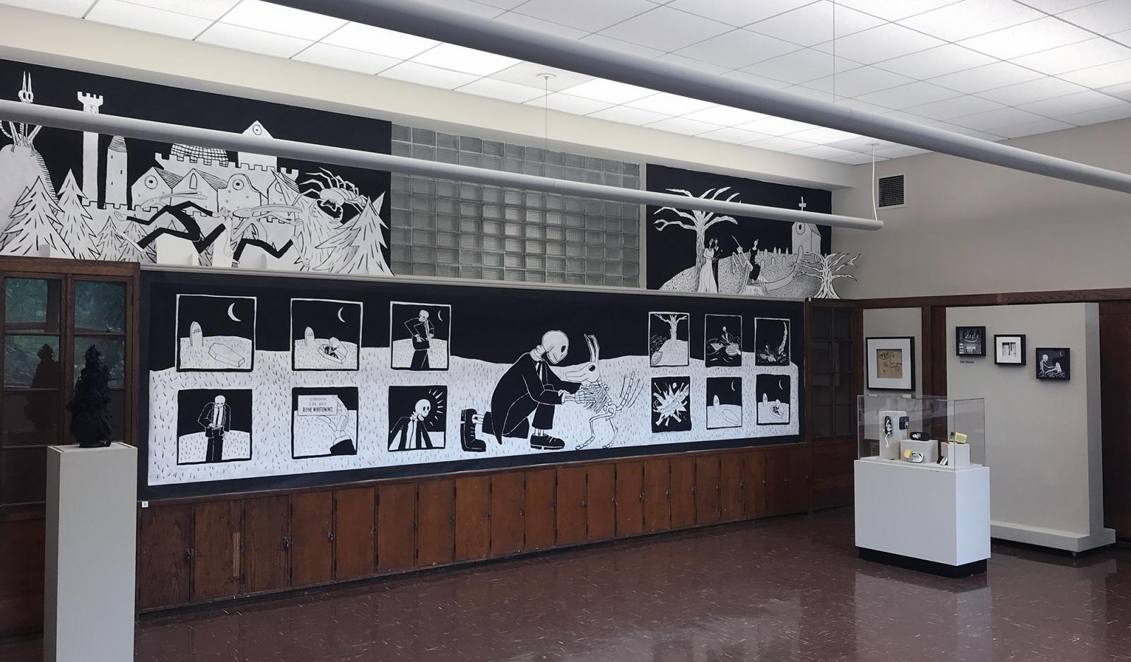 This is an installation at the Greenbelt Arts Center, and features large tyvek paintings, shadow boxes, and dozens of tiny dioramas in altiod tins, spoons and watches.