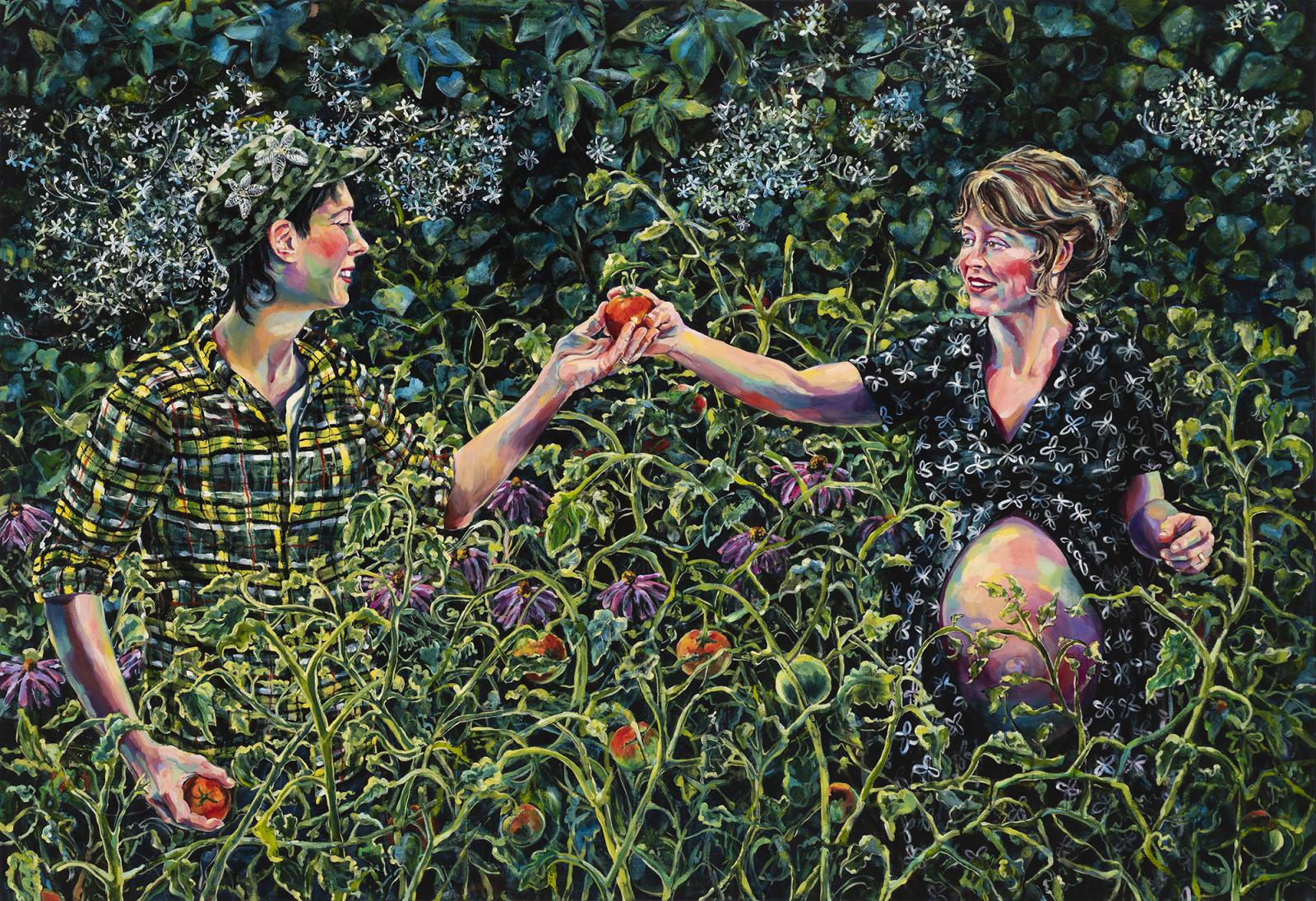 I place my work in the context of identity politics. As a feminist and a lesbian, I identify strongly with the concept of ‘other’ in my personal life and in my painting. I have a desire to see images of my sub-culture presented in museums and galleries. I use narrative, symbolism, fantasy, and autobiography to depict a taboo intimacy between women—acknowledging and emphasizing the female gaze. I draw on my own life to build narratives that are part fantasy and part memory as I investigate themes of otherness with celebratory optimism. I present myself in my work in the form of a self-portrait, whether I am literally depicting myself and my partner or other women as stand-ins for me. The body is the universal signifier of identity and the self-portrait is arguably the most intimate signifier of identity. By creating self-portraits, literally or metaphorically, I am sewing pieces of myself into each image with undeniable contemporaneity. I enter into dialogue with artists who have come before me by appropriating compositional elements of works by artists like Frida Kahlo, Egon Schiele, Henri Rousseau and Magritte.I place my work in the context of identity politics. As a feminist and a lesbian, I identify strongly with the concept of ‘other’ in my personal life and in my painting. I have a desire to see images of my sub-culture presented in museums and galleries. I use narrative, symbolism, fantasy, and autobiography to depict a taboo intimacy between women—acknowledging and emphasizing the female gaze. I draw on my own life to build narratives that are part fantasy and part memory as I investigate themes of otherness with celebratory optimism. I present myself in my work in the form of a self-portrait, whether I am literally depicting myself and my partner or other women as stand-ins for me. The body is the universal signifier of identity and the self-portrait is arguably the most intimate signifier of identity. By creating self-portraits, literally or metaphorically, I am sewing pieces of myself into each image with undeniable contemporaneity. I enter into dialogue with artists who have come before me by appropriating compositional elements of works by artists like Frida Kahlo, Egon Schiele, Henri Rousseau and Magritte.Featured Work