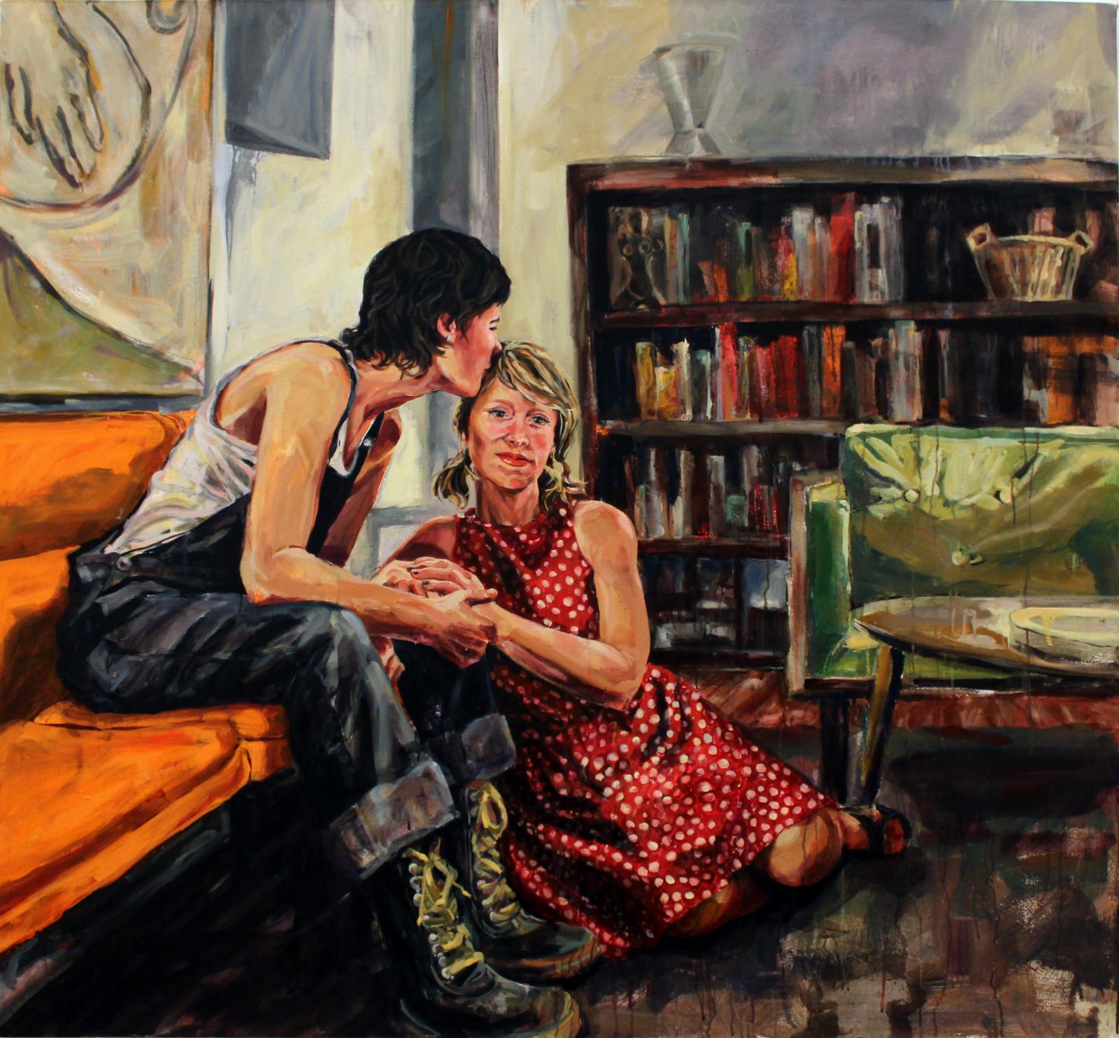 Joan draws on her life with her partner of twenty three years as well as the intimate lives of lesbian couples in her community. She focuses on stories championing their undeniably intense, complex, celebratory, and still taboo relationships. Her paintings encourage viewers to recognize and celebrate the authenticity of intimate relationships between two women, highlighting and affirming the true tenets of love.