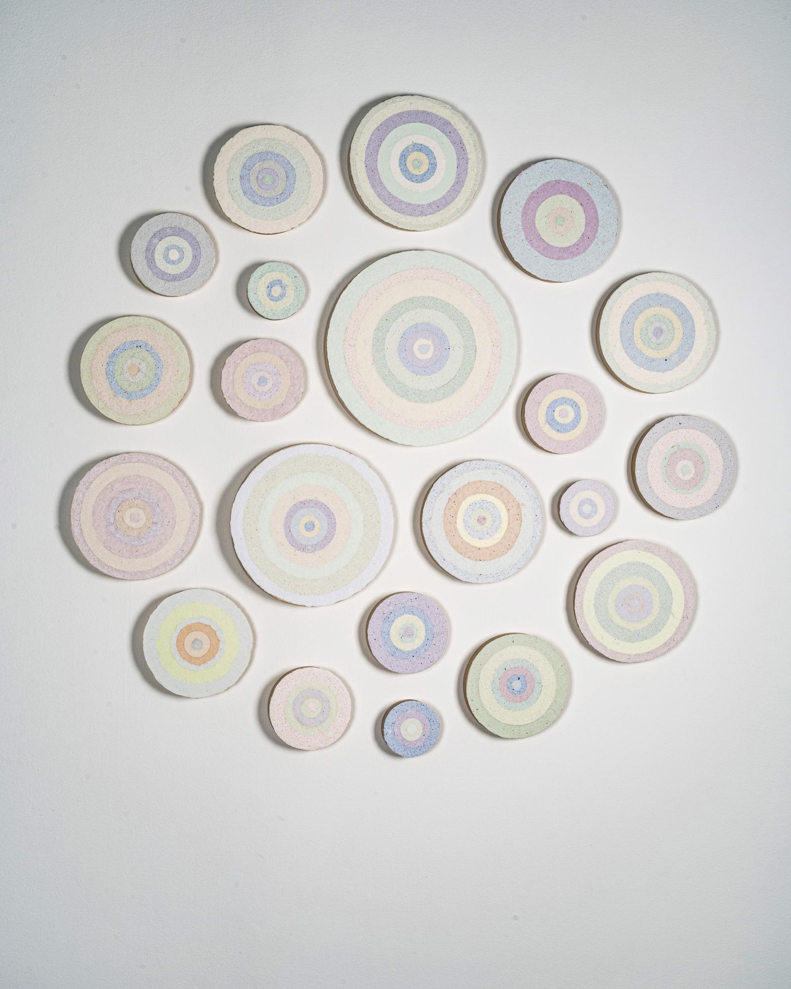 My current body of work lies at the intersection of the natural world and domestic space. In one body of work, I use the trope of stylized wallpaper pattern to reflect upon our fraught relationship with nature and our increasing separation from it in modern life. In the series Wallpapers for a Warming World, plant motifs such as ferns are depicted for their soil remediation attributes, while other motifs reflect both domestic and invasive species. The battle for territory between the domestic and invasive is engaged in a wallpaper pattern intended for the beautification of domestic spaces, while also evoking the current march toward decreasing biodiversity. In another body of work, I cast paper from recycled former screenprints into new work, forming concentric circles that mimic the growth rings of trees and compose these rings into wall-mounted installations.