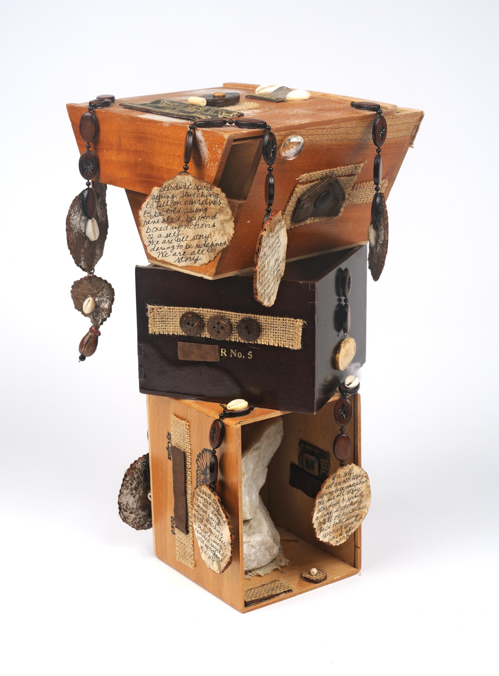 Past and future ancestors, the Middle Passage, and the rhythms of water and wind are the subjects of my oil and acrylic paintings. I especially enjoy weaving wood, paper, crystals, glass, text, fibers, images, jewelry, cloth, and weird trinkets into mixed-media compositions. Some pieces are prayers for racial healing; some are totem poems; some are sculpted avatars. Art journals, accordion pop-ups, and reimagined books are artifacts of my contemplative spiritual practices.
