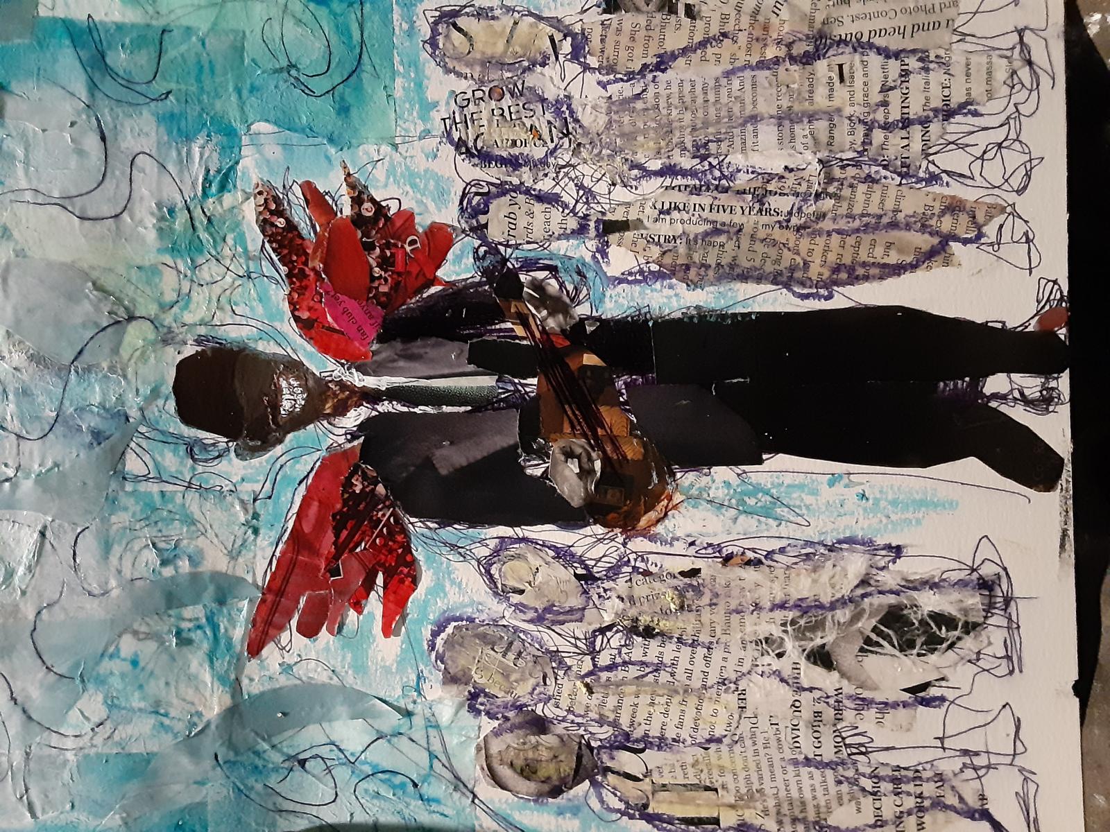 Collage painting inspired by a collaborative experience between a poet and an artist to move beyond illustration and evoke and challenge both to move beyond both.
