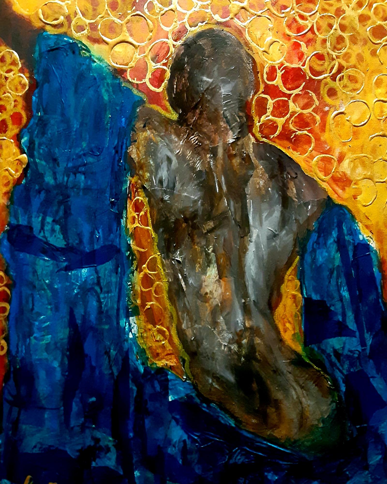 See more information about Painted boy (wings)Medium: Acrylic and found paperYear: 2023Details: 16 x 16 -