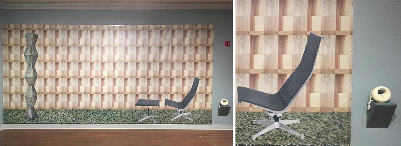 left) Picture Window Looking West, 115" x 115", and (right) Mod-Style Hearth, 115" x 184", 2018, mixed media works printed on vinyl with found object (red Genie phone). (foreground) Shag Lawn, vinyl floor print, 50” x 50”. At right: detail view.