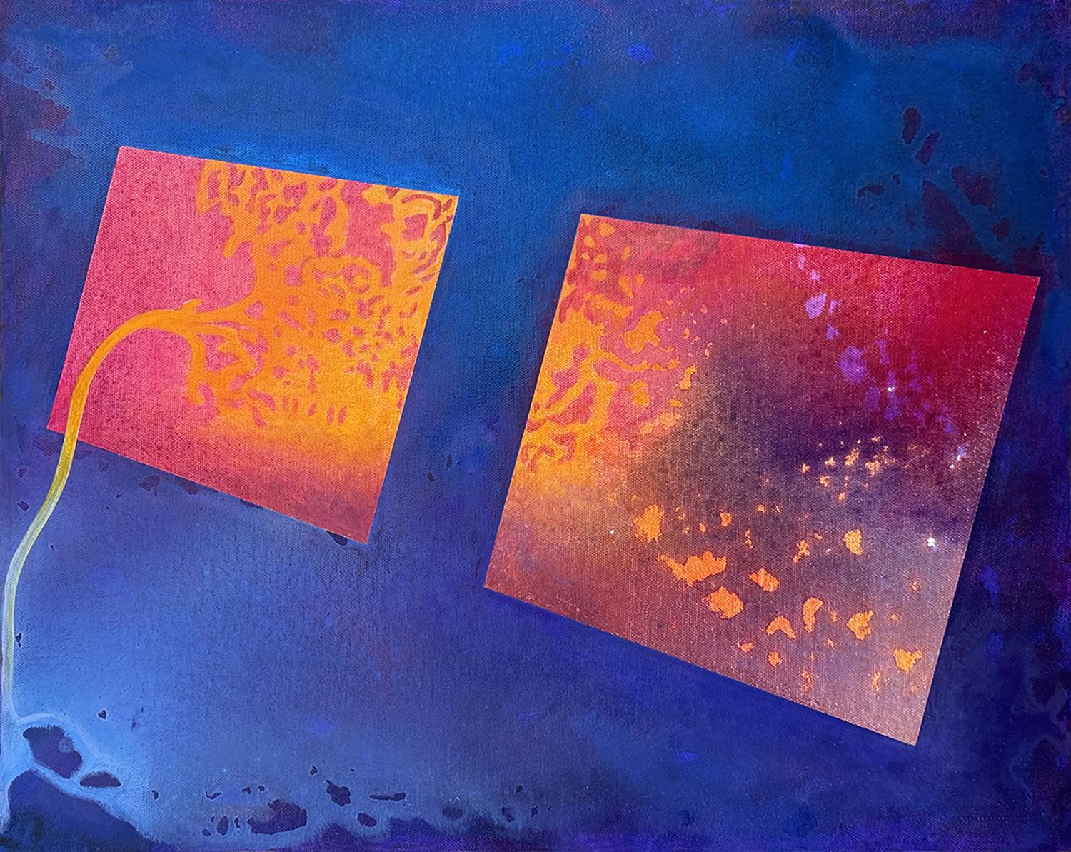 This group of paintings demonstrate my interest in utilizing grid structures to imagine multi-layered scenarios. In addition to the foundational window structures common to each painting, I rely on contrasting color value clusters to ensure a degree of figure/ground give and take. With four of these paintings (“Reach”, “Idea”, “Ayers Rock Struck By A Blue Meteor”, and “Infusion”), I’m initiating different kinds of connecting elements that link together various parts of the spatial “realities” depicted in each painting. In the remaining two paintings (“Convergence” and “Determining Intersections”), I don’t introduce connecting links, but parts of the boundaries between some of the grid structures break down, resulting in a different kind of flow between the windowed scenarios.Featured Work