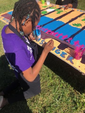 The 4' x 16' rural murals are created on wood panels at table top height making the activity accessible to all. It takes 10 three hour sessions to complete each mural. We provide all the materials required for the activity including paints, brushes, tables, tents, and smocks.